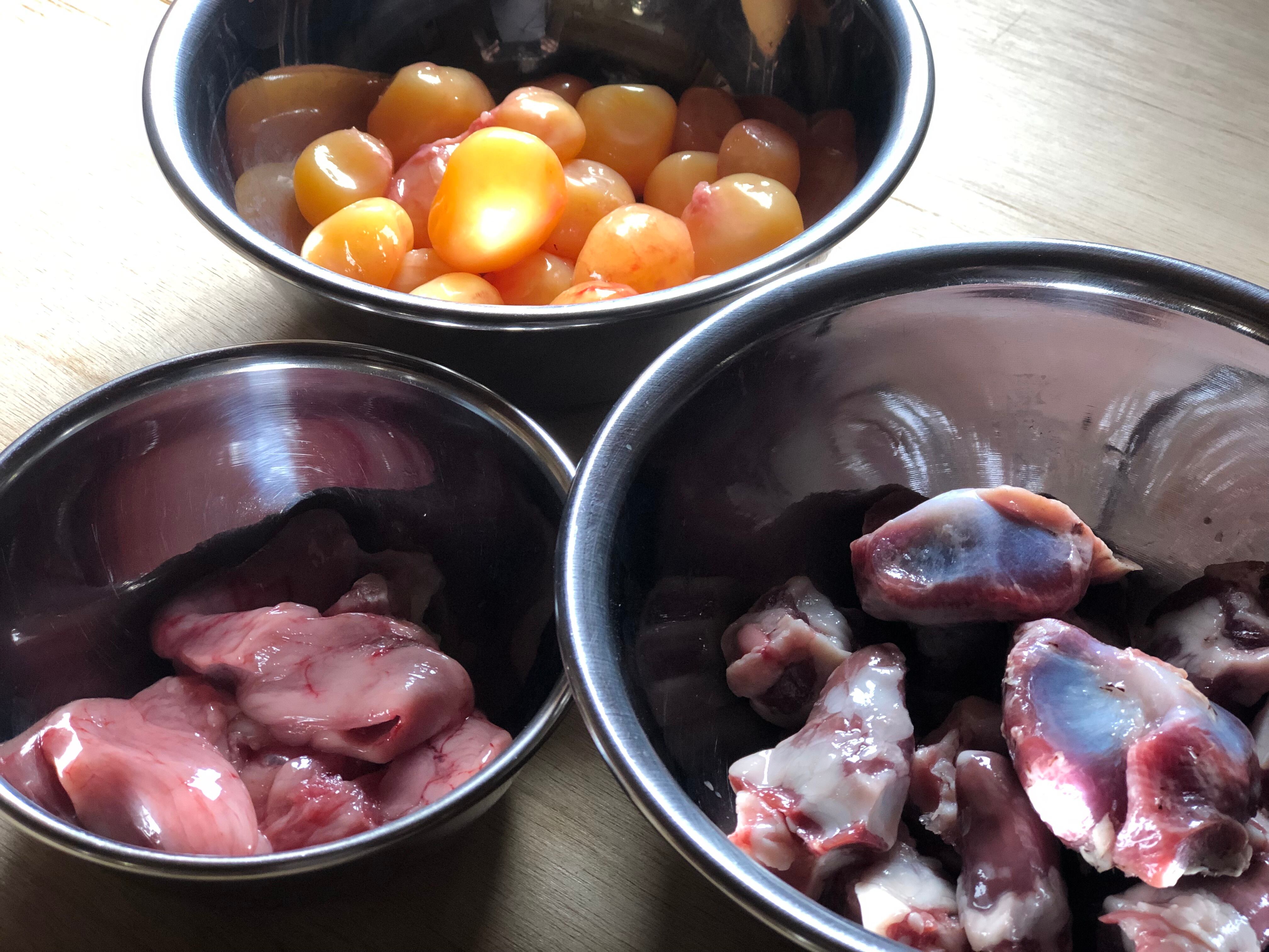 百姓のいえの平飼い鶏は、適度な日光と新鮮な空気を取り入れた鶏舎で元気に歩き回っています。飼育期間中はもちろん加工処理する直前まで鶏にストレスをなるべくかけないよう配慮しています。もつは内臓の各部位の総称で、内容は、砂肝・ハツ・きんかん・卵かんのミックスになっています。平飼い鶏のもつは大変希少ですので、この機会にご賞味ください。塩糀やにんにく醤油漬けなどで味付けしBBQや鍋物・煮物におすすめです。