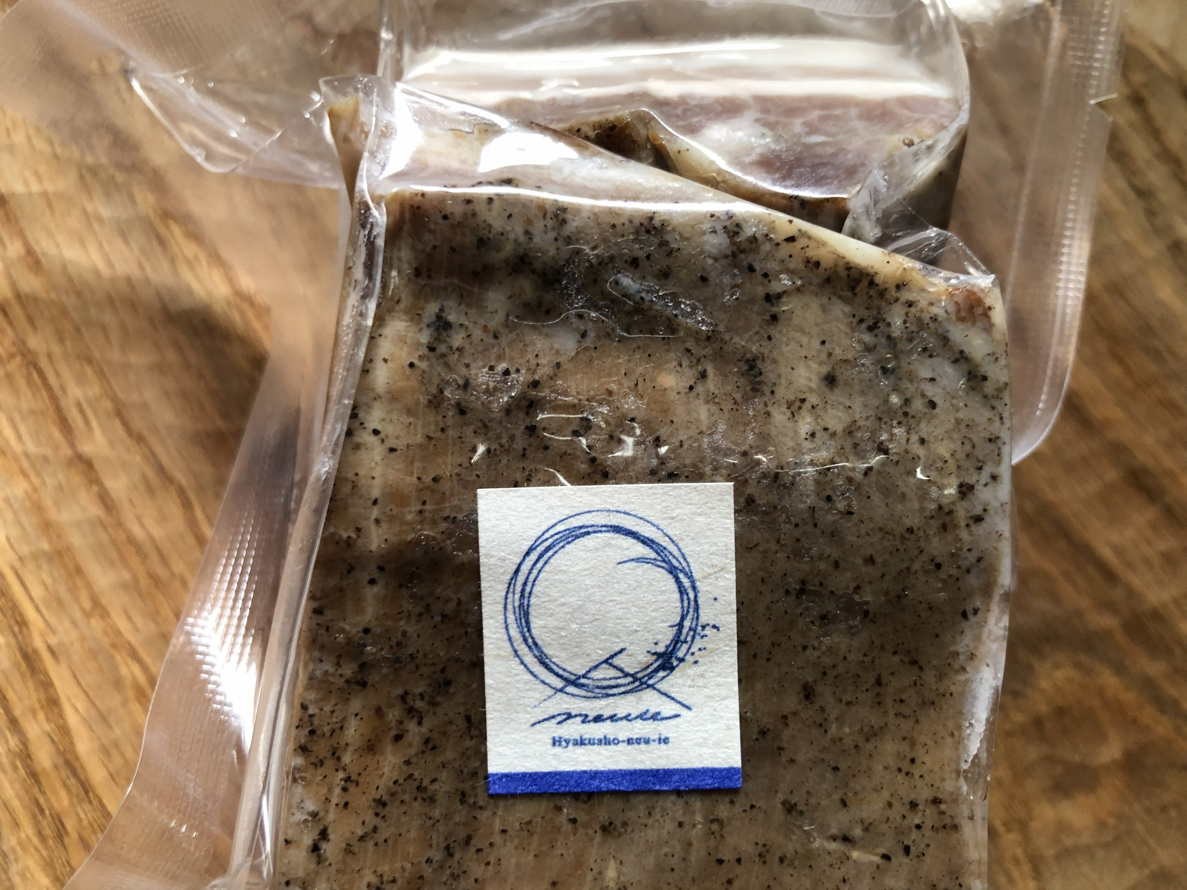 百姓のいえの放牧黒豚は、自由に歩き回れるスペースで豚本来の性質を大切にしながら飼育しています。餌は、道内産・国産の材料を使用し、栄養バランスの良い配合にして与えています。また、飼育期間中はもちろん、加工処理する直前まで豚にストレスをなるべくかけないよう配慮しています。こうして育てた豚肉は、臭みがなく、適度な弾力、脂身はさっぱりしつつも旨味があります。ベーコンにはバラ肉を使用し、肉の旨みが凝縮する「乾塩式製法」です。甘みの増した脂もお楽しみいただけます。お好みのサイズにカットし加熱してお召し上がりください。味付けも食品添加物や保存料などは使用せず、シンプルな原材料で仕上がっています。